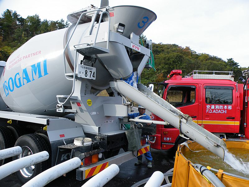 いわき地区生コンクリート協同組合は18日、いわき市で開かれた30年度緊急消防救助隊地域ブロック(北海道・東北ブロック)合同訓練においてコンクリートミキサー車による消防用水運搬訓練に参加した。