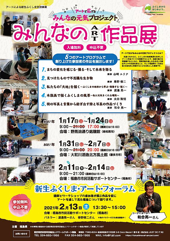 福島県内各地で開催していた「アートで広げる みんなの元気プロジェクト」(2020 年10月~2021年1月)で創り上げた作品の展示会、「みんなのART作品展」が始まりました!