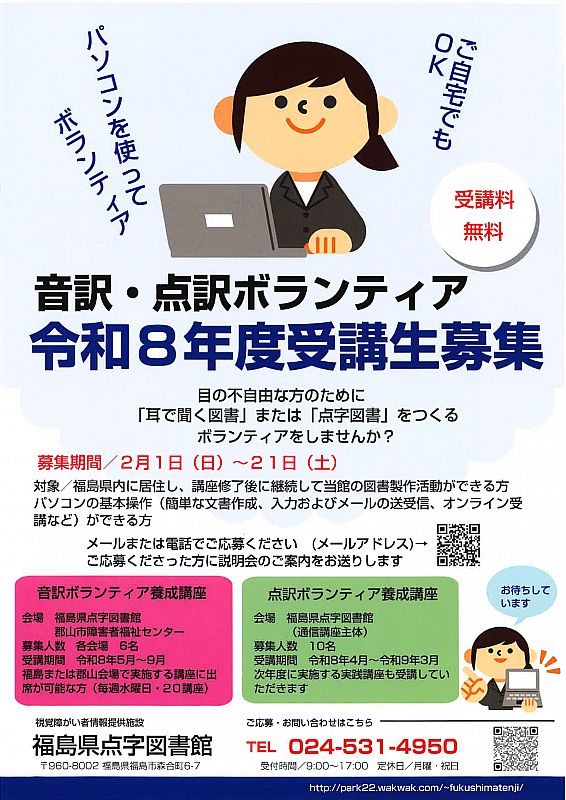 > ニュース一覧 > 【受講生募集‼】令和8年度『音訳・点訳ボランティア』受講生募集のお知らせ (ふくしまニュースWeb )- 2026.02.07(土) 07:30