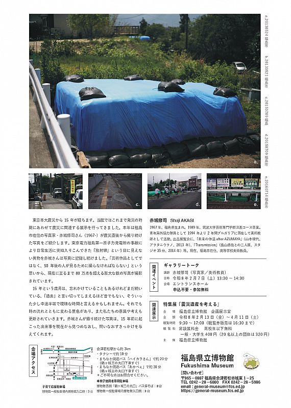 15 年という歳月は、忘れかけていることもあるけれどまだ続いている、「過去」と言い切ってしまえるほど昔でもない、そういった少し中途半端で曖昧な時間と言えるかもしれません。それでも時の流れとともに変わる景色があり、また私たちの意識や考えも更新されていきます。赤城さんが撮り続けた写真は、15 年前に起こった出来事を現在から見つめなおし、問いなおすきっかけを与えてくれます。