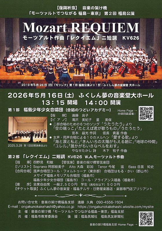 このプロジェクトは、音楽を通じて未来へ新しい夢や幸福が育まれることを願い、企画されました。当日は、福島の震災復興を祈念し、福島と東京の合唱団が手を取り合い、モーツァルトの名曲『レクイエム』を奏でます。