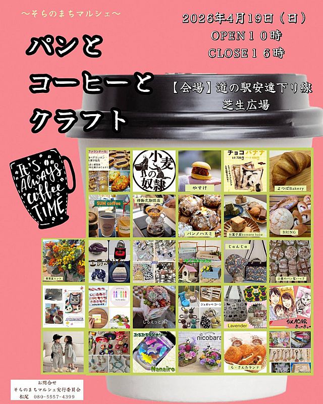 2026年4月19日(日)、二本松市の道の駅「安達」智恵子の里・下り線の芝生広場にて、「パンとコーヒーとクラフト」を開催します。