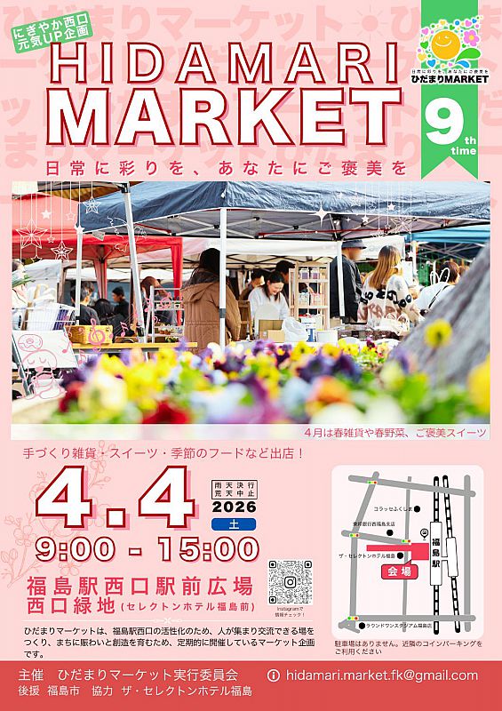> ニュース一覧 > 4月4日(土)、JR福島駅西口で春のマルシェ「第9回ひだまりマーケット」開催‼(ふくしまニュースWeb )- 2026.03.16(月) 08:00