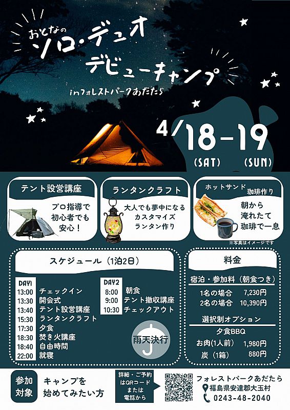 2026年4月18日(土)~19日(日)、「おとなのソロ・デュオ デビューキャンプinフォレストパークあだたら」を開催します!