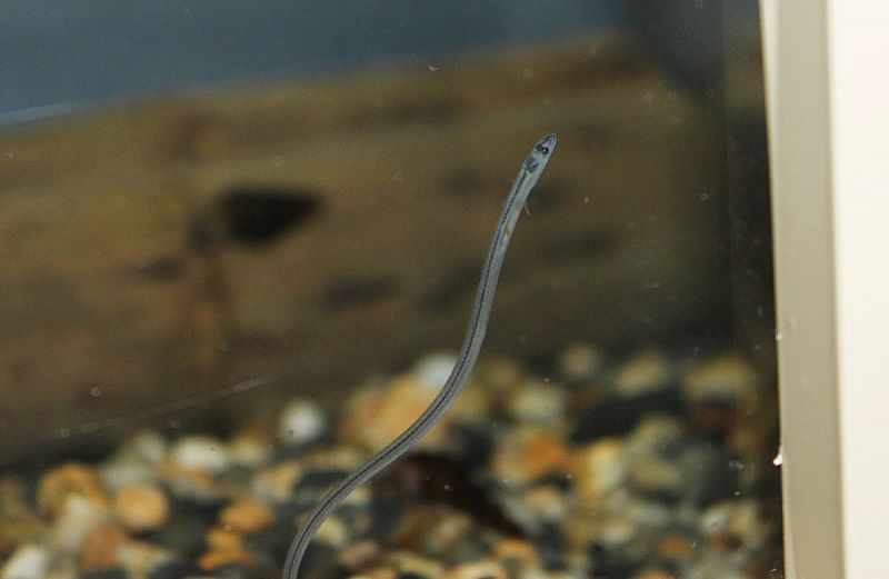 このプロジェクトの調査で、今年は1月上旬からいわき市内でシラスウナギの遡上が確認されました。今回展示した個体は、今年の2月上旬から3月上旬にかけて採集したもののうち30個体で、淡水馴致し、摂餌を確認してから展示を開始しました。