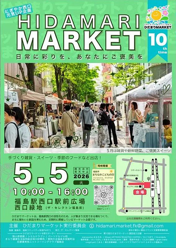 > ニュース一覧 > 5月5日、JR福島駅西口で「第10回ひだまりマーケット」を開催します‼(ふくしまニュースWeb )- 2026.04.22(水) 12:30
