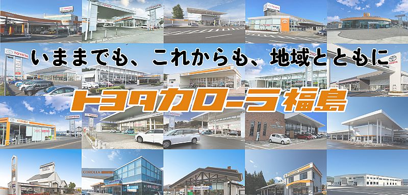 トヨタカローラ福島株式会社は、福島県内の中通り地方・会津地方を中心に、昭和36年の創業以来、地域の皆様へカーライフを通して貢献させていただき今日を迎えております。今後も自動車が県内の主要交通手段であることを充分に踏まえまして、時代の変化や多様化するお客様のご要望に応えるべく、万全の体制にて「安心・信頼・満足」のいただけるカーディーラーとして活動してまいります。