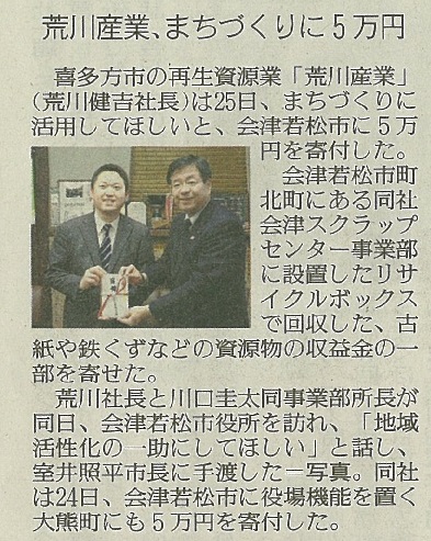 > ニュース一覧 > リサイクルボックス収益金を寄付致しました(荒川産業)- 2015.12.29(火) 11:17