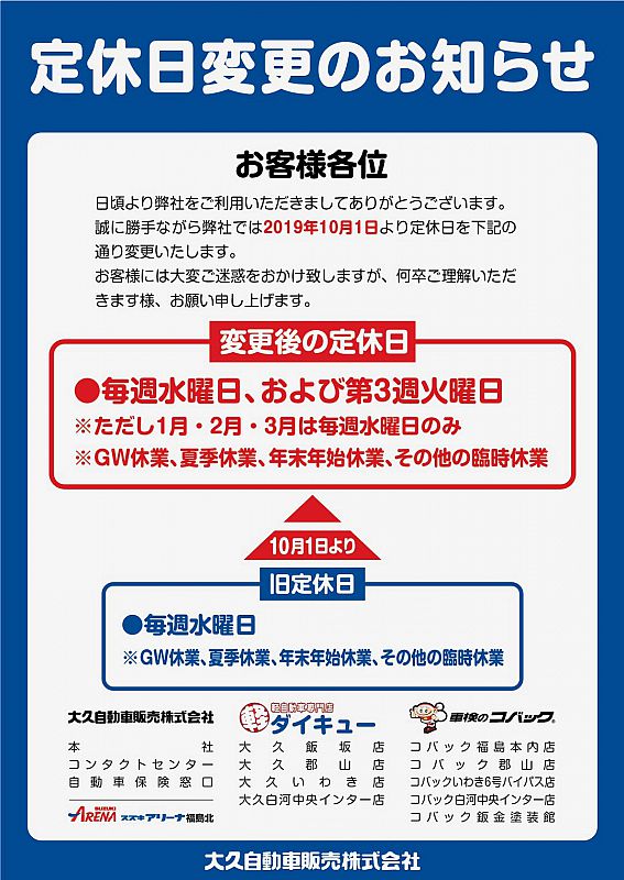 > ニュース一覧 > ◆10月からの定休日変更について◆(大久自動車販売株式会社)- 2019.10.11(金) 11:00