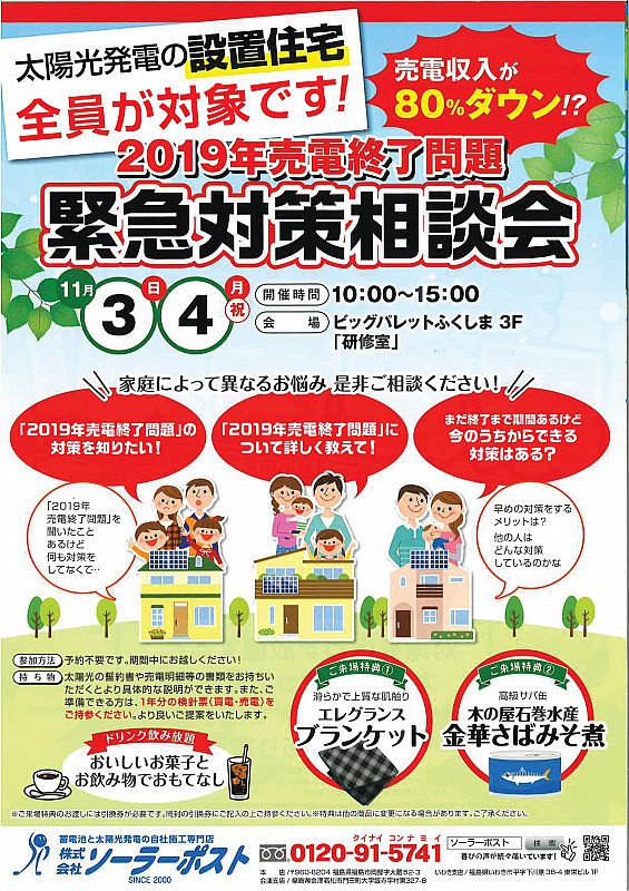 > ニュース一覧 > 【郡山市】売電終了緊急対策相談会※参加無料※(ソーラーポスト)- 2019.10.21(月) 17:24