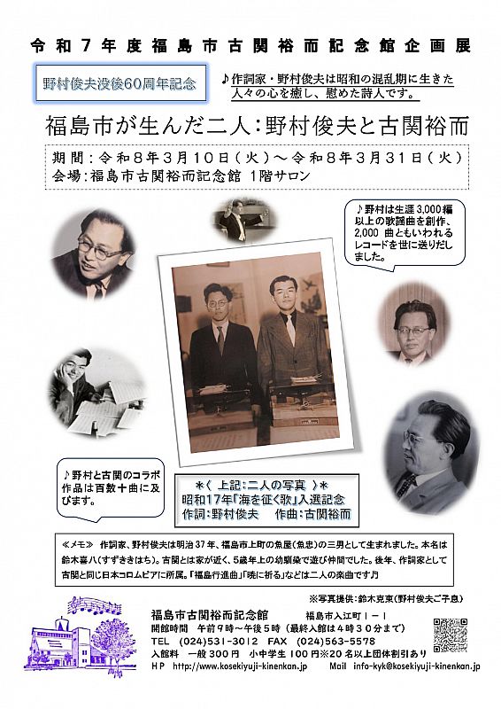 野村俊夫没後60周年・企画展「福島市が生んだ二人:野村俊夫と古関裕而」古関裕而記念館で開催
