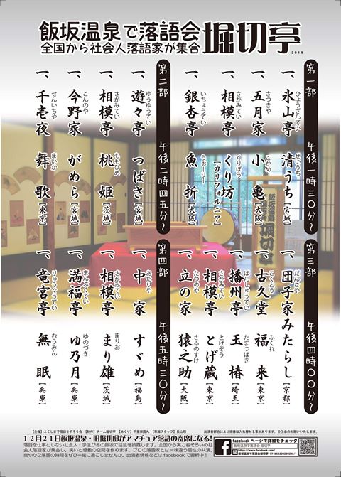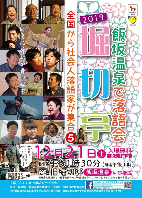 > ニュース一覧 > 2019年12月21日(土)、「飯坂温泉で落語会『堀切亭』2019」を福島市の旧堀切邸で開催します(ふくしまニュースWeb )- 2019.12.01(日) 07:30