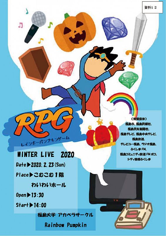 > ニュース一覧 > 福島大学アカペラサークルRainbow Pumpkin 冬ライブ -RPGレインボーパンプキンゲームー(福島大学)- 2020.02.06(木) 13:44