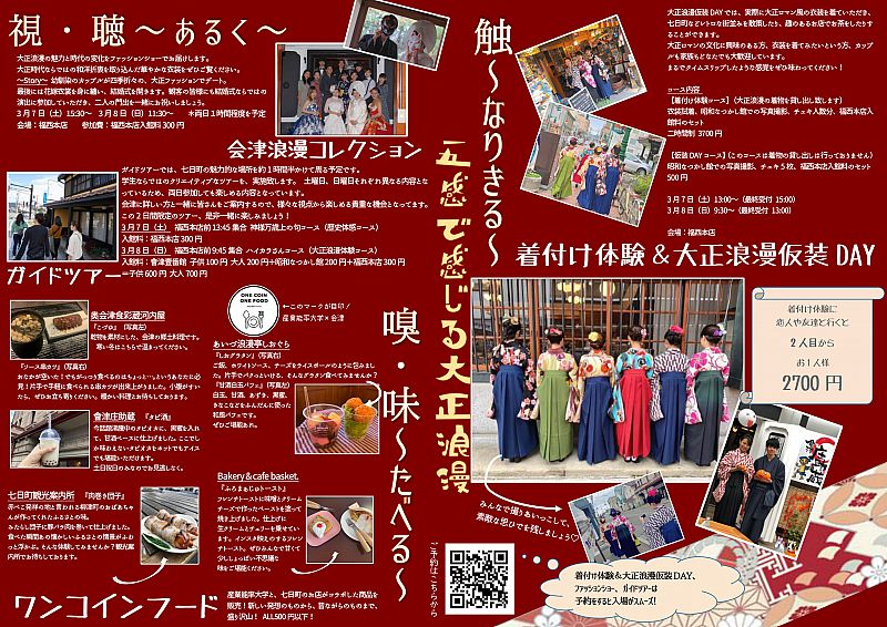 まるで、歴史の息吹が聞こえる城下町、福島県会津若松市にて、「触~なりきる~」「視・聴~あるく~」「嗅・味~たべる~」の視点で体験が可能なイベントを、NPO法人会津エンジンと産業能率大学の学生が協力し開催します。