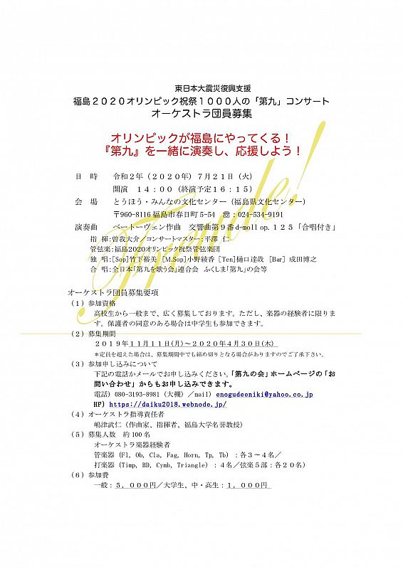 > ニュース一覧 > 東日本大震災復興支援 第24回ふくしま「第九」の会コンサート オーケストラ団員募集のお知らせです。(ふくしまニュースWeb )- 2021.04.02(金) 07:30