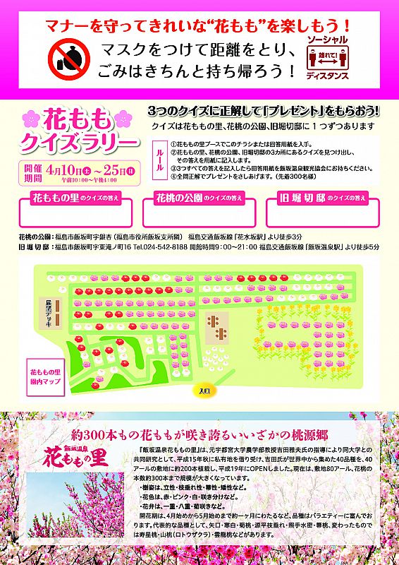 > ニュース一覧 > 2021年の飯坂温泉「花ももの里」の開園期間は、4月10日~25日を予定しています。世界中から集めた40種・約300本の花ももが見頃を迎えます(ふくしまニュースWeb )- 2021.03.29(月) 07:30