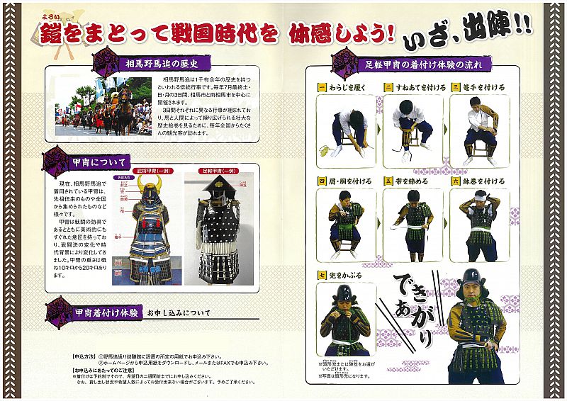 南相馬市の野馬追通り銘醸館では、大人気の「甲冑着付け体験」を行っております。随時受け付けておりますので、希望日の2週間前までにご予約ください。鎧をまとって戦国時代を体験しよう!