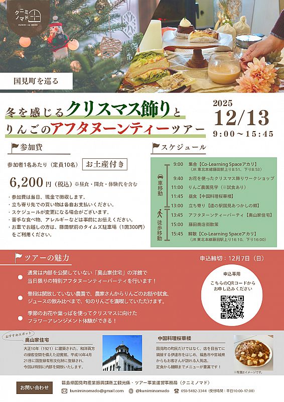 【参加者募集】国見町を巡る「冬を感じるクリスマス飾りとりんごのアフタヌーンティーツアー」