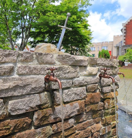英国の英雄アーサー王がもっていたとされる剣「エクスカリバー」が、湖の妖精によって贈られたという伝説になぞらえ、エクスカリバーが泉に刺さったデザインになっています。