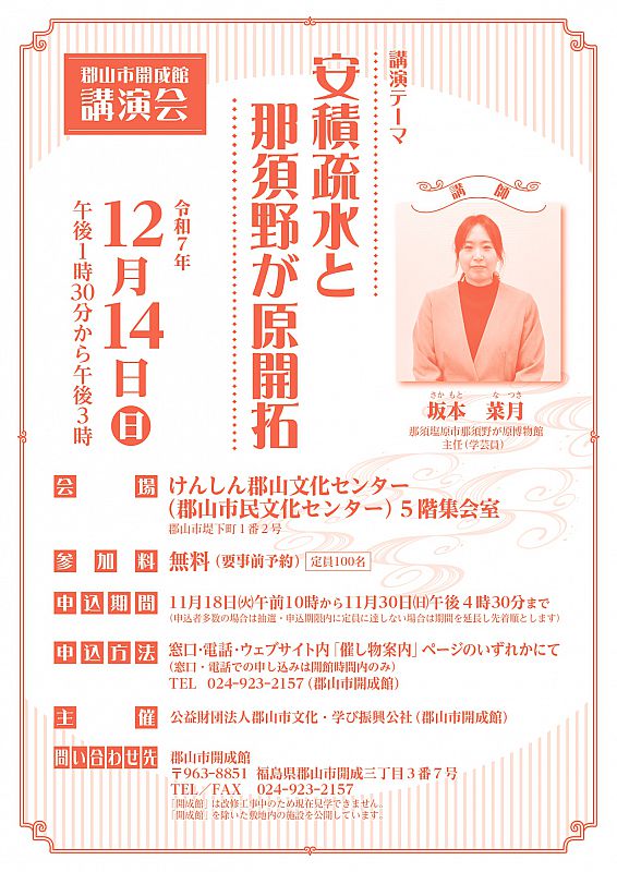 【11/18申込開始】郡山市開成館講演会「安積疏水と那須野が原開拓」