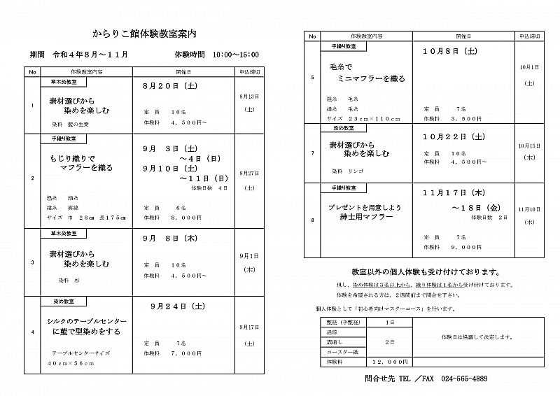 かわまたおりもの展示館・からりこ館から、体験教室(令和4年8月~11月)のご案内です