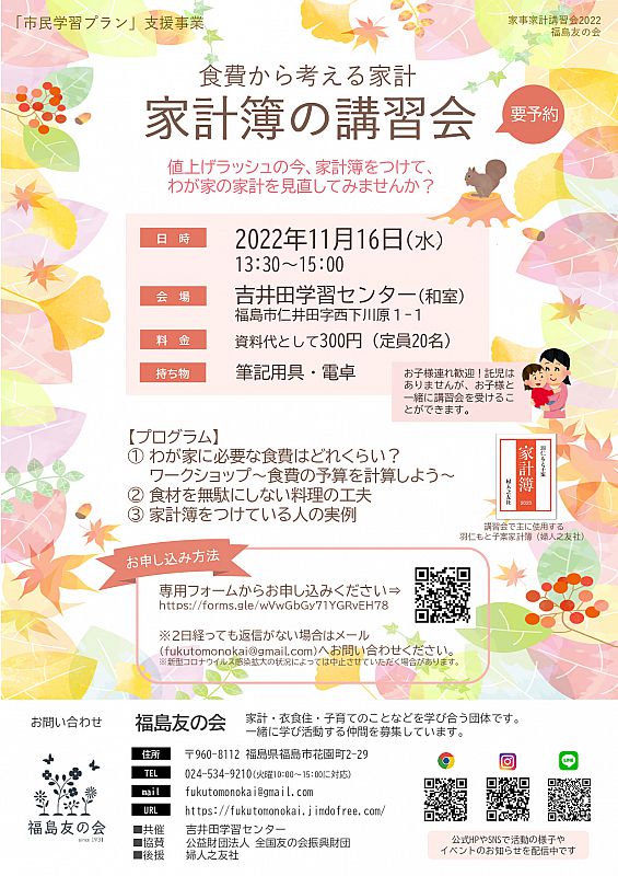2022年11月16日(水)、福島市の吉井田学習センターで、「家計簿の講習会 -食費から考える家計-」を開催します。家計・衣食住・子育てなどを学び合う団体「福島友の会」と、吉田学習センターの共催事業です。