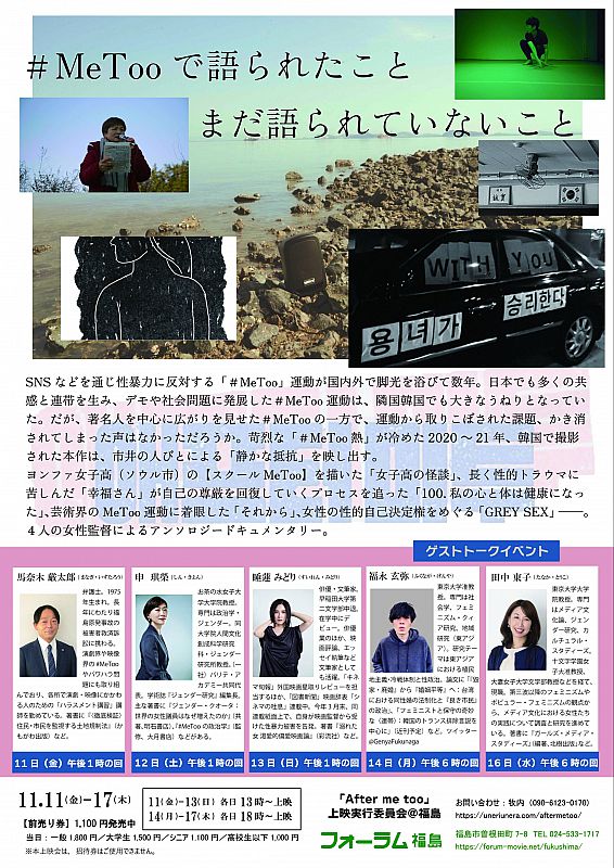 > ニュース一覧 > 【日本初公開】11/11~11/17 韓国最新ドキュメンタリー「After me too」上映会開催(ふくしまニュースWeb )- 2022.11.02(水) 07:30