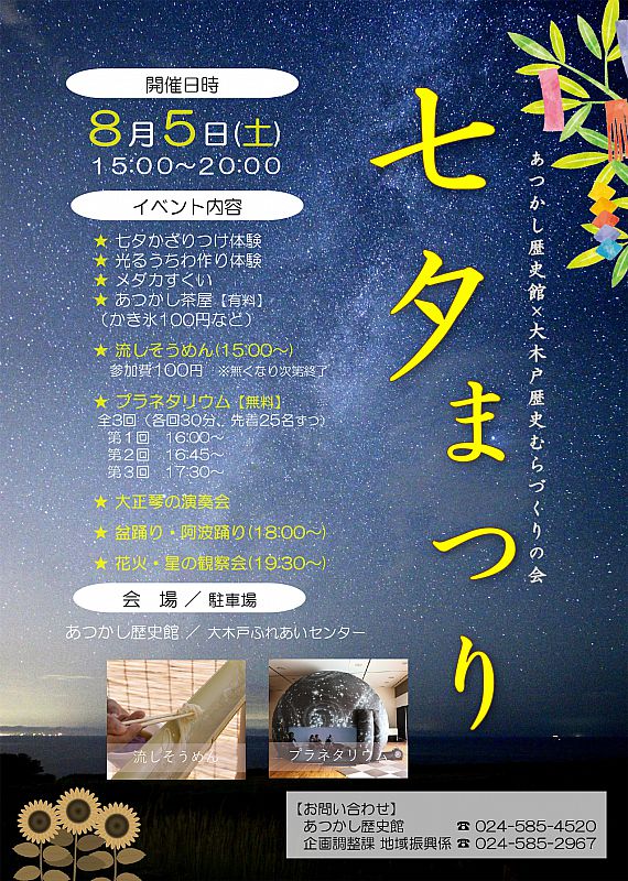 令和5年8月5日(土)に、あつかし歴史館×大木戸歴史むらづくりの会「七夕まつり」を開催します。流しそうめんやプラネタリウム、大正琴の演奏会、花火・星の観察会など、楽しい催しが盛り沢山です! ぜひ、お越しください。