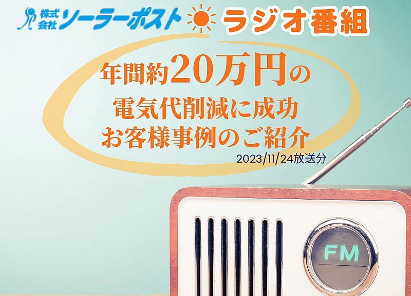 > ニュース一覧 > 【ラジオ】「年間約20万円の電気代削減に成功 お客様事例のご紹介」 2023年11月24日放送(ソーラーポスト)- 2023.12.14(木) 12:26
