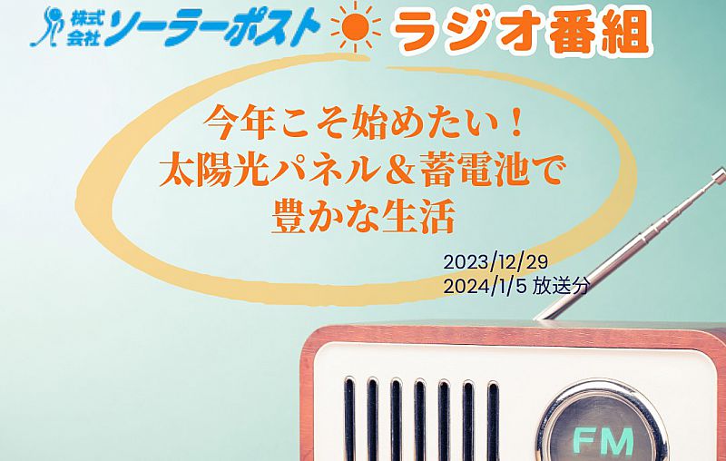 > ニュース一覧 > 【ラジオ】「今年こそ始めたい!太陽光パネル&蓄電池で豊かな生活」 2023年12月29日/2024年(ソーラーポスト)- 2024.01.12(金) 17:22