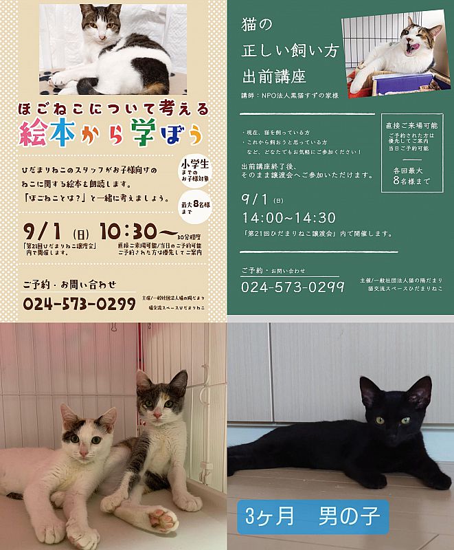9月1日「ひだまりねこde譲渡会」を福島市で開催 猫の里親さまを募集