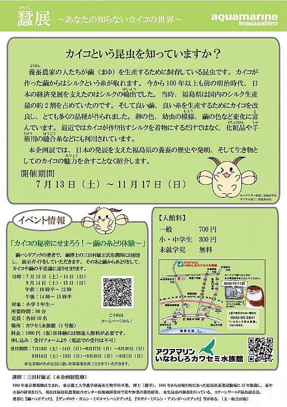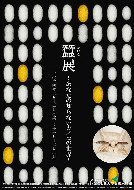 > ニュース一覧 > 企画展「蠶展~あなたの知らないカイコの世界~」開催中【アクアマリンいなわしろカワセミ水族館】(ふくしまニュースWeb )- 2024.08.19(月) 07:30