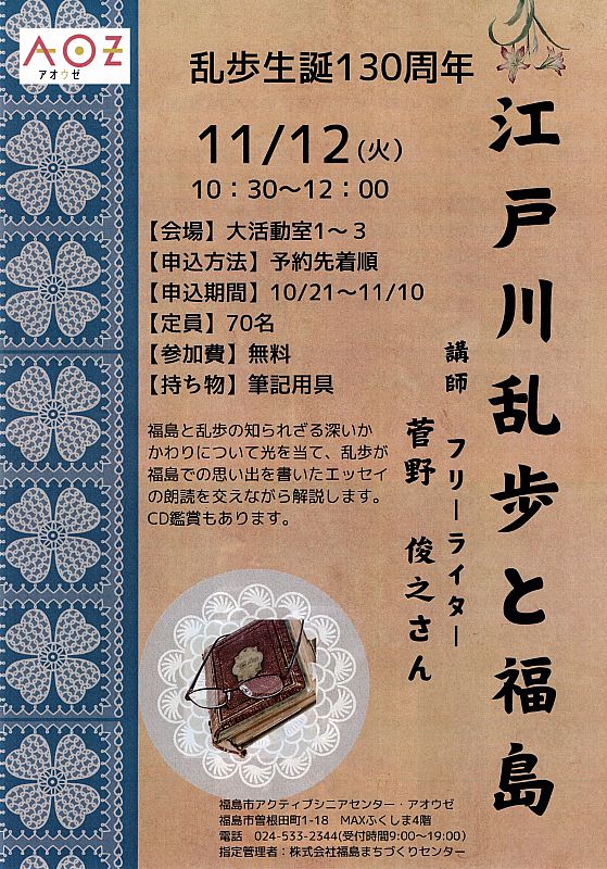 アオウゼで文学講座「江戸川乱歩と福島」開催 10月21日から申込開始