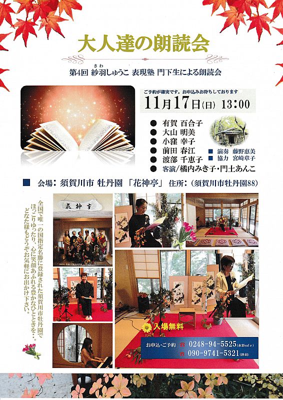 2024年11月17日(日)、第4回 紗和(さわ)しゅうこ表現塾門下生による大人達の朗読会を、須賀川市牡丹園「花神亭」で開催します。