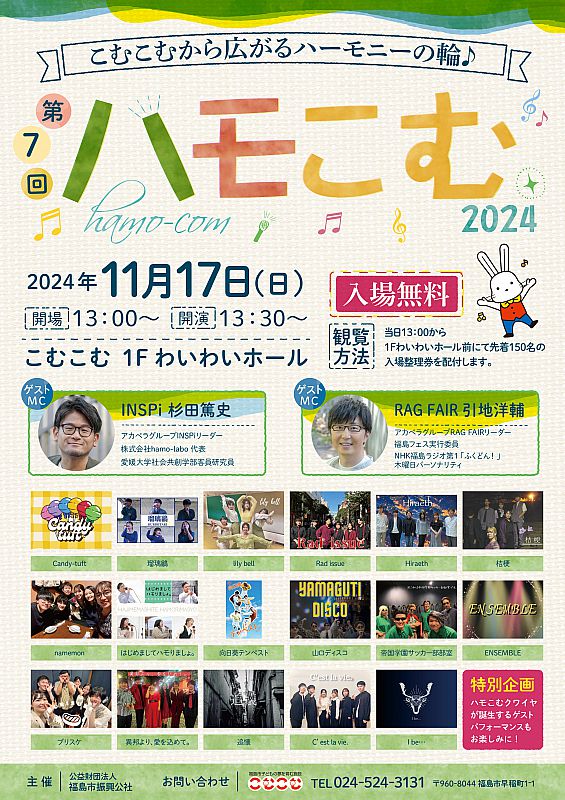 > ニュース一覧 > 11月17日「第7回ハモこむ こむこむから広がるハーモニーの輪♪」開催(ふくしまニュースWeb )- 2024.11.04(月) 12:00