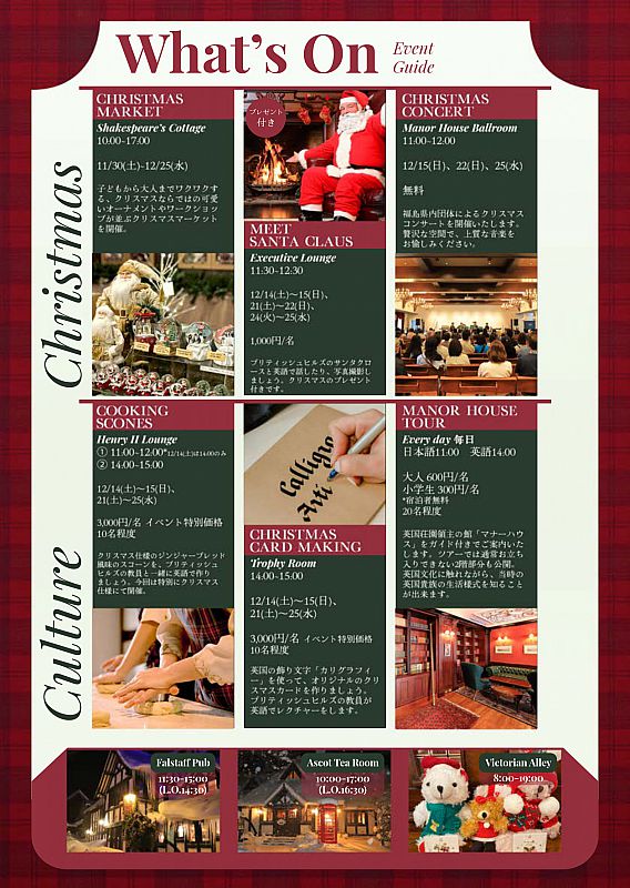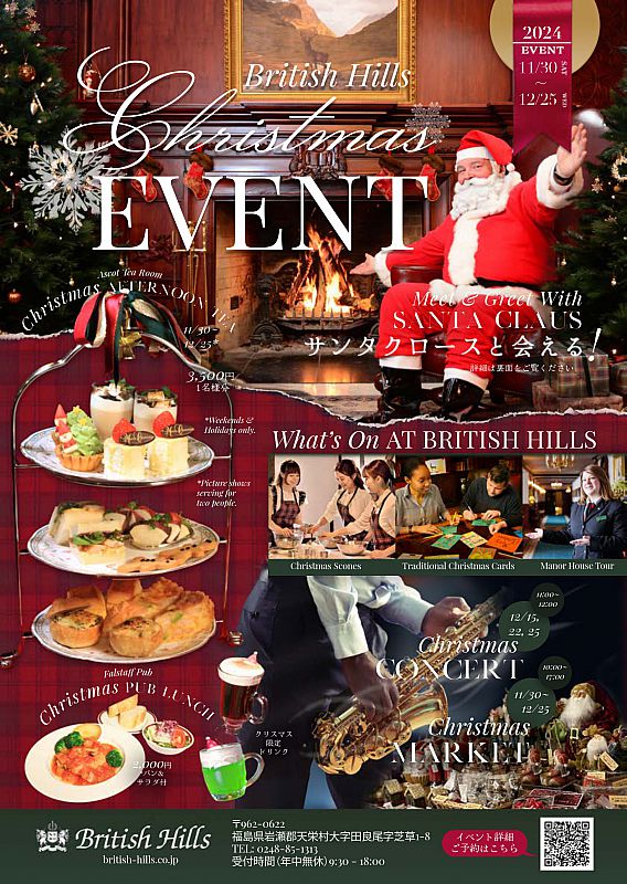 1994 年の設立から100万人以上の来訪者を誇るブリティッシュヒルズ(福島県天栄村)は、今年も11月30日(土)~12月25日(水)に「クリスマスイベント」を開催します。今年は子どもから大人までワクワクする「サンタグリーティング」を初開催。本物の英国建築と伝統に囲まれた空間で、心温まるクリスマスを体験いただけます。イベントでは、クリスマスマーケットや心躍るクリスマスコンサートなど、多彩なプログラムをご用意しています。また、英国伝統のスコーン作りやクリスマスカード作りなどの体験型アクティビティも楽しめます。まるで英国に訪れたかのような特別なひとときをお過ごしください。