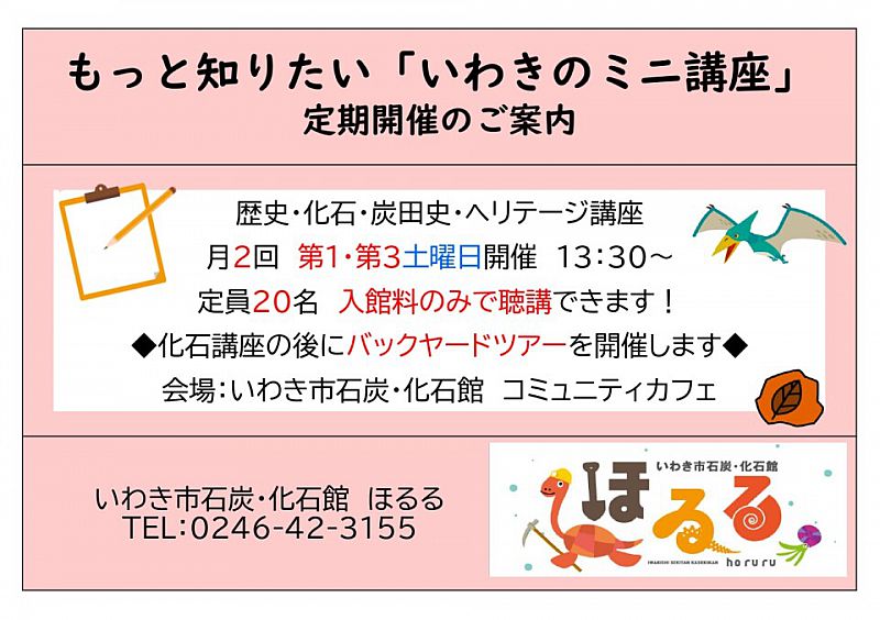 > ニュース一覧 > 3月に開催する「いわきのミニ講座」をご案内します!【いわき市石炭・化石館ほるる】(ふくしまニュースWeb )- 2025.02.27(木) 12:00
