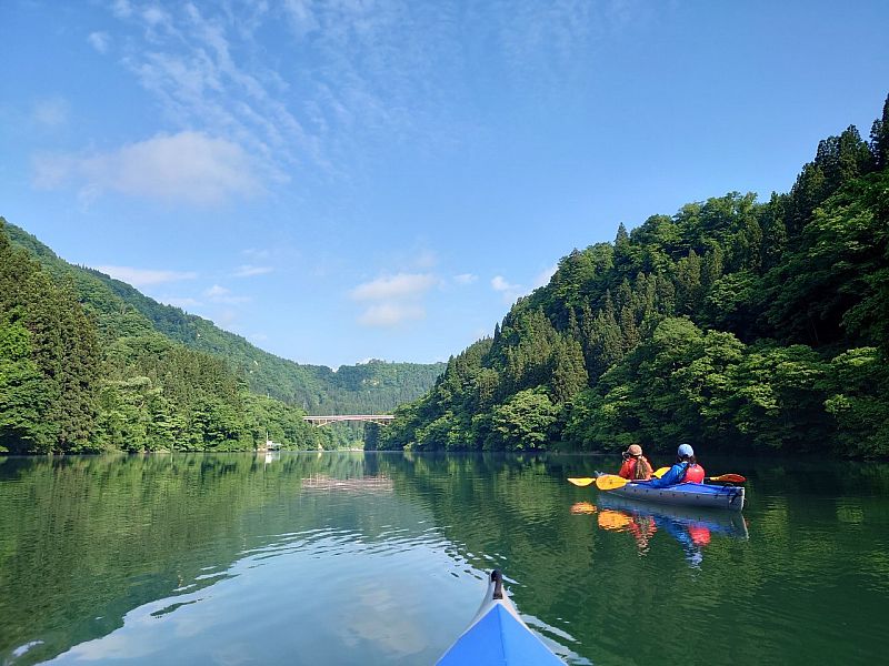 只見川での唯一のカヤックツアーエリアは、ダムによって水量がコントロールされており、シーズンを通して穏やかな水面が広がります。