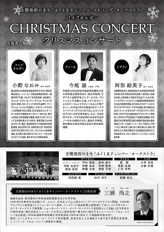 2025年12月21日(日)に、福島市のふくしん夢の音楽堂で、古関裕而のまち「ふくしまチェンバー・ストリング・オーケストラ」によるパイプオルガン・クリスマスコンサートを開催します。パイプオルガン独奏や、クリスマス歌曲集など少し早いクリスマスをお楽しみください。只今、チケットを好評発売中です。ぜひご来場ください。