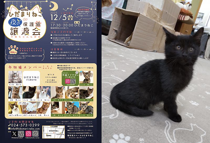 > ニュース一覧 > 【12/5開催】福島市ひだまりねこで「夜の保護猫譲渡会」 里親さまを募集(ふくしまニュースWeb )- 2025.11.24(月) 12:30