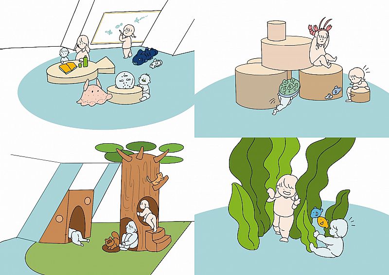 親子で水槽を眺めながらごろごろしたり、動物の巣穴にもぐりこんだり。赤ちゃんがゆったり過ごせるエリアです。