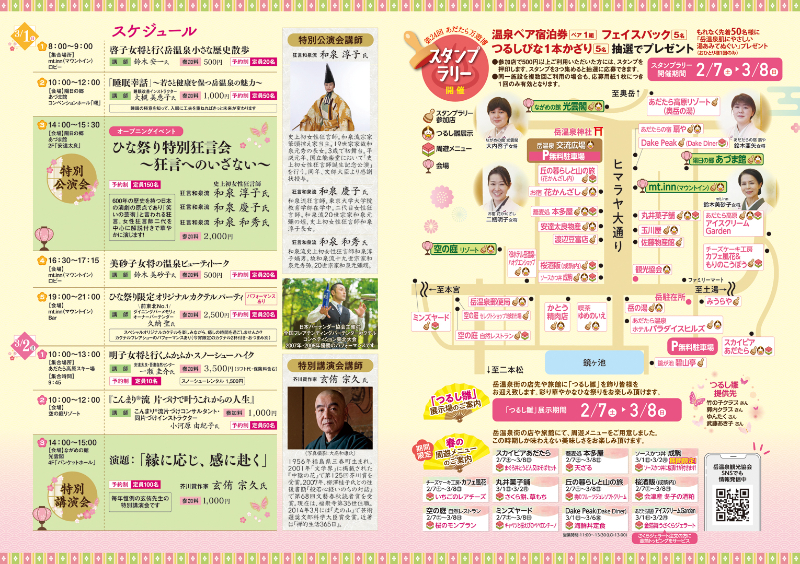 温泉街が華やかに彩られる「つるし雛かざり」展示や、素敵な賞品が当たる「スタンプラリー」、期間限定の「春の周遊メニュー」も同時開催! ぜひ早春の岳温泉へお越しください。