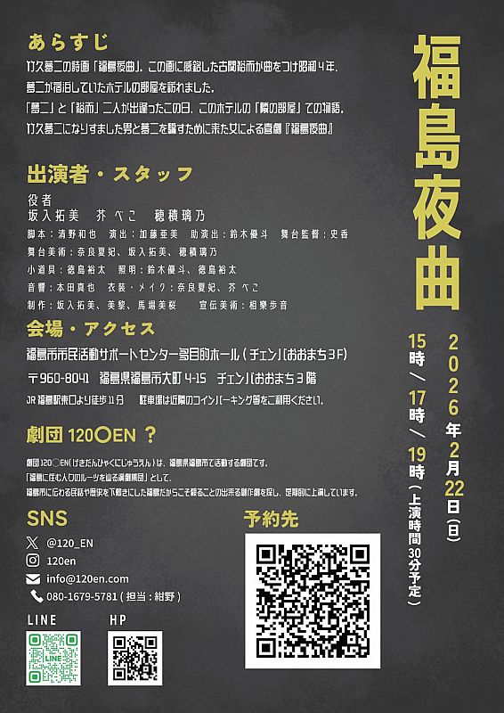 > ニュース一覧 > 【福島市】劇団120◯EN 新人公演『福島夜曲』2/22開催 ご予約受付中(ふくしまニュースWeb )- 2026.02.13(金) 13:00