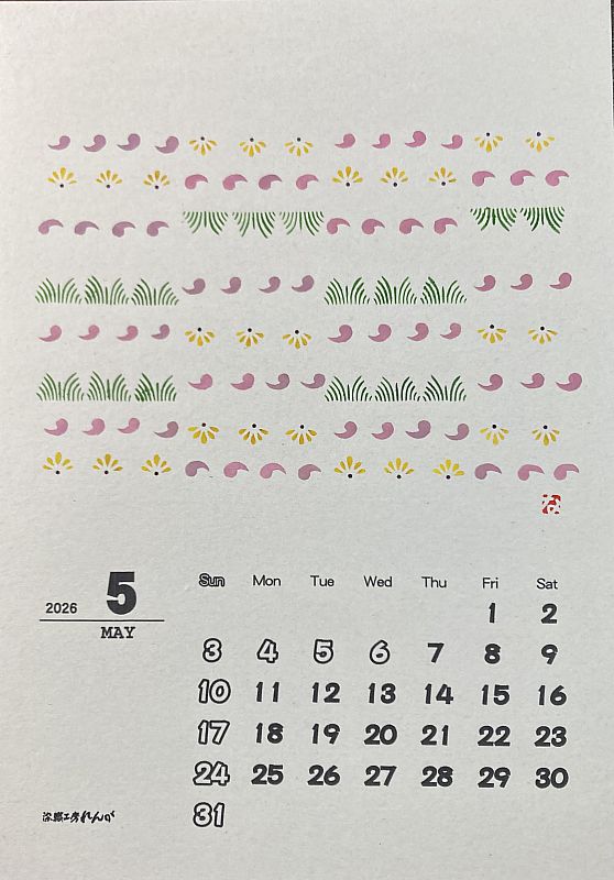 2枚目の画像は、福咲和紙(機械すき)と着物の染型紙「会津型」のコラボカレンダー2026です。5月は、「菖蒲・勾玉」と、ちょっとポップな風合いの可愛い絵柄の会津型です。「染工房れんが」(喜多方市)で販売しています。