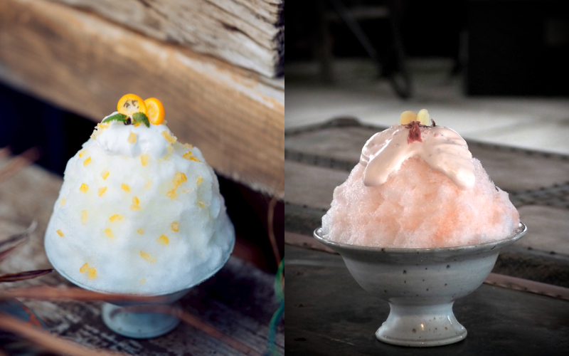 ラベンダーの華やかな香りが楽しめます。ふわふわの氷の中には、オレンジピールとレモンパンナコッタ。仕上げに、オレンジクリームととろ~り蜂蜜を上からかけています。