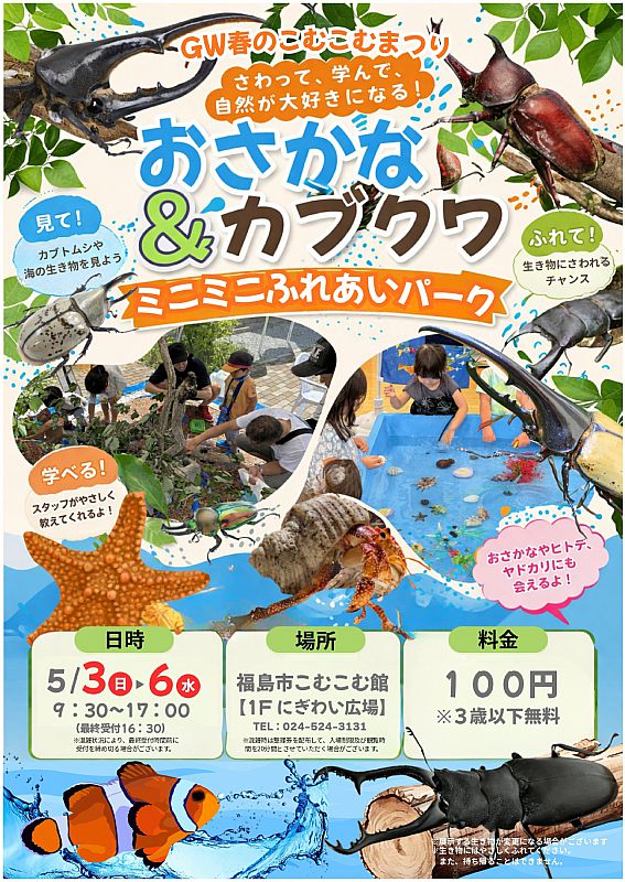 > ニュース一覧 > 【5/3〜6開催】GWはこむこむへ!「おさかな&カブクワ ミニミニふれあいパーク」(ふくしまニュースWeb )- 2026.04.19(日) 07:30