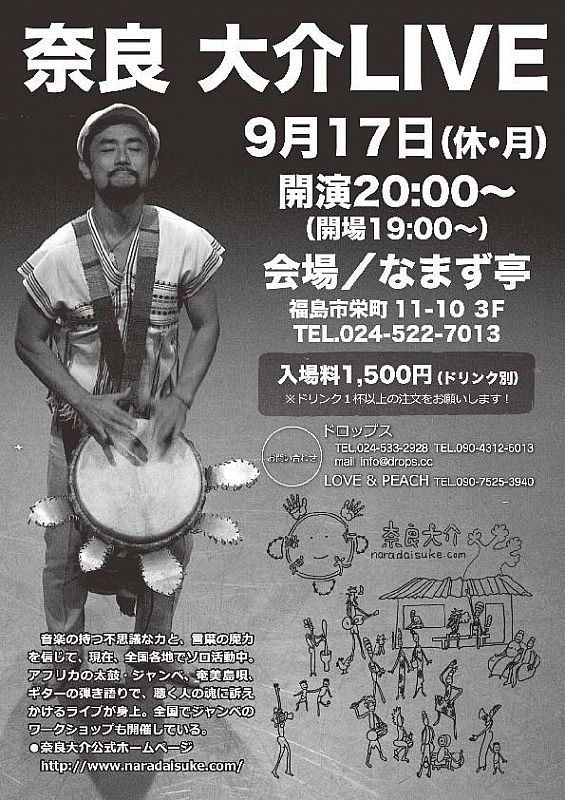 > ニュース一覧 > 奈良大介ジェンベライブ。三線、ギターもあるよ(ドロップス)- 2012.08.31(金) 16:53